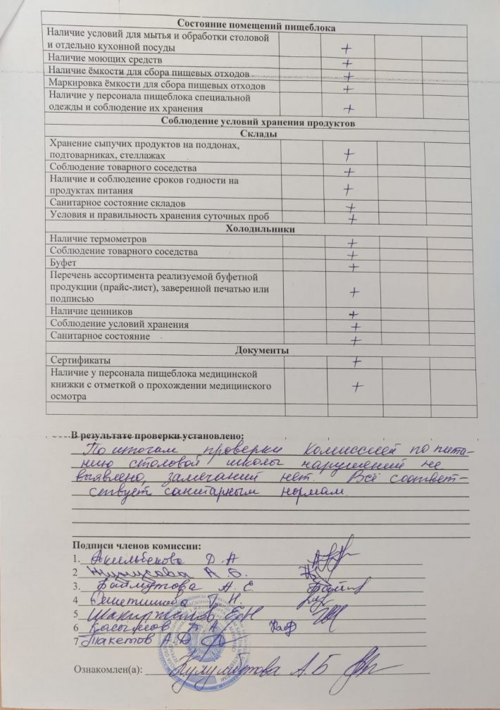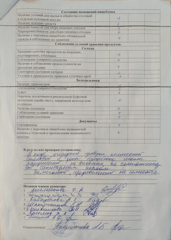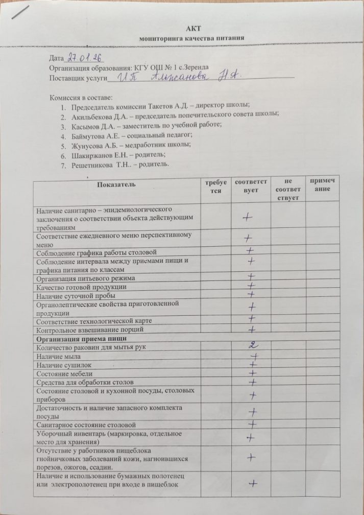 Тамақтану бойынша мониторингтік комиссияның мектеп асханасын тексеру актісі 2025-2026 оқу жылы