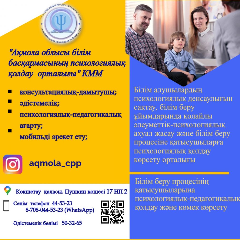 БАЙЛАНЫС МӘЛІМЕТТЕРІ: КОКШЕТАУ ҚАЛАСЫ, ПУШКИН КӨШЕСІ 17 НП 2, СЕНІМ ТЕЛЕФОНЫ 44-53-23, 8-708-044-53-23 (ВАТСАП), ӘДІСТЕМЕЛІК БӨЛІМІ 50-32-65, ИНСТАГРАМ aqmola_cpp.